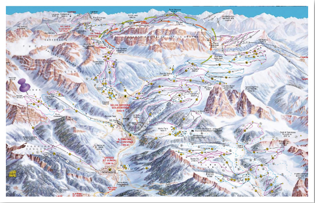 Val Gardena kayak merkezi, Selva Gardena, St. Cristina ve Ortisei – St. Ulrich olmak üzere 3 kasaba ve 500 km pisti kapsıyor. Liftlerin kalitesi ve ana gondollara ulaşım Avusturya’nınkilerle karşılaştırılamaz ama pistler gerçekten çok uzun ve çok güzel. Ski safari için çok uygun. Bir de Sellaronda denilen ünlü bir dairesel kayak rotaları var. Bu daireyi her iki yönde de giderek tamamlayabiliyorsunuz. Benim favorim ise St. Cristina’daki Seceda tepesine çıkıp Ortisei’ye kadar inen 11 km uzunluğundaki pist. Pist gerçekten muhteşem. Bir de pistin sonuna doğru bir virajı dönüyorsunuz ve karşınıza bir anda aşırı şirin bir cafe/bar ve pistin hemen yanında buraya ait kırmızı sinema koltuğuna benzer ve piste doğru bakan koltuklar çıkıyor. Yanında da kocaman kırmızı harflerle “HOT (Sıcak)” yazıyor. Yazıyı görür görmez eşime “Kesin bu koltuklar ısıtmalı” dedim ve haklı çıktım! O kadar uzun ve keyifli bir pistin sonunda sıcak koltuklarda sıcak şarap içme zevkini siz bir düşünün artık!