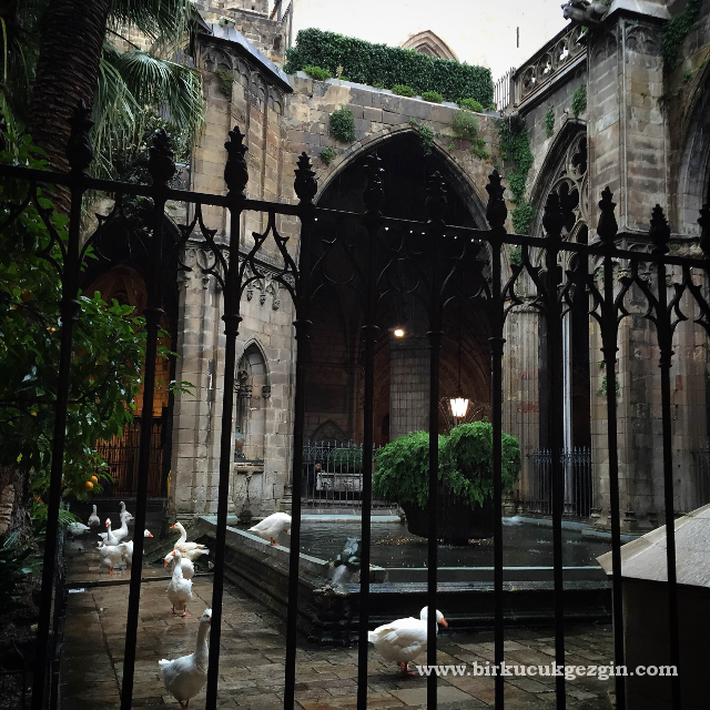 Barselona Katedrali gotik tarzda yapılmış güzel bir yapı ama bence kaçırılmaması gereken yeri arka tarafında gizli. Arkada bir iç avlu bahçesi var girişi Carrer del Bisbe’den (Bisbe sokağı). Biz burayı ertesi gün yağmur altında sokaklarda kaybolurken keşfettik ve bayıldık. Az kalsın kaçırıyormuşuz. Yağmur altında ayrıca bir güzeldi bence…