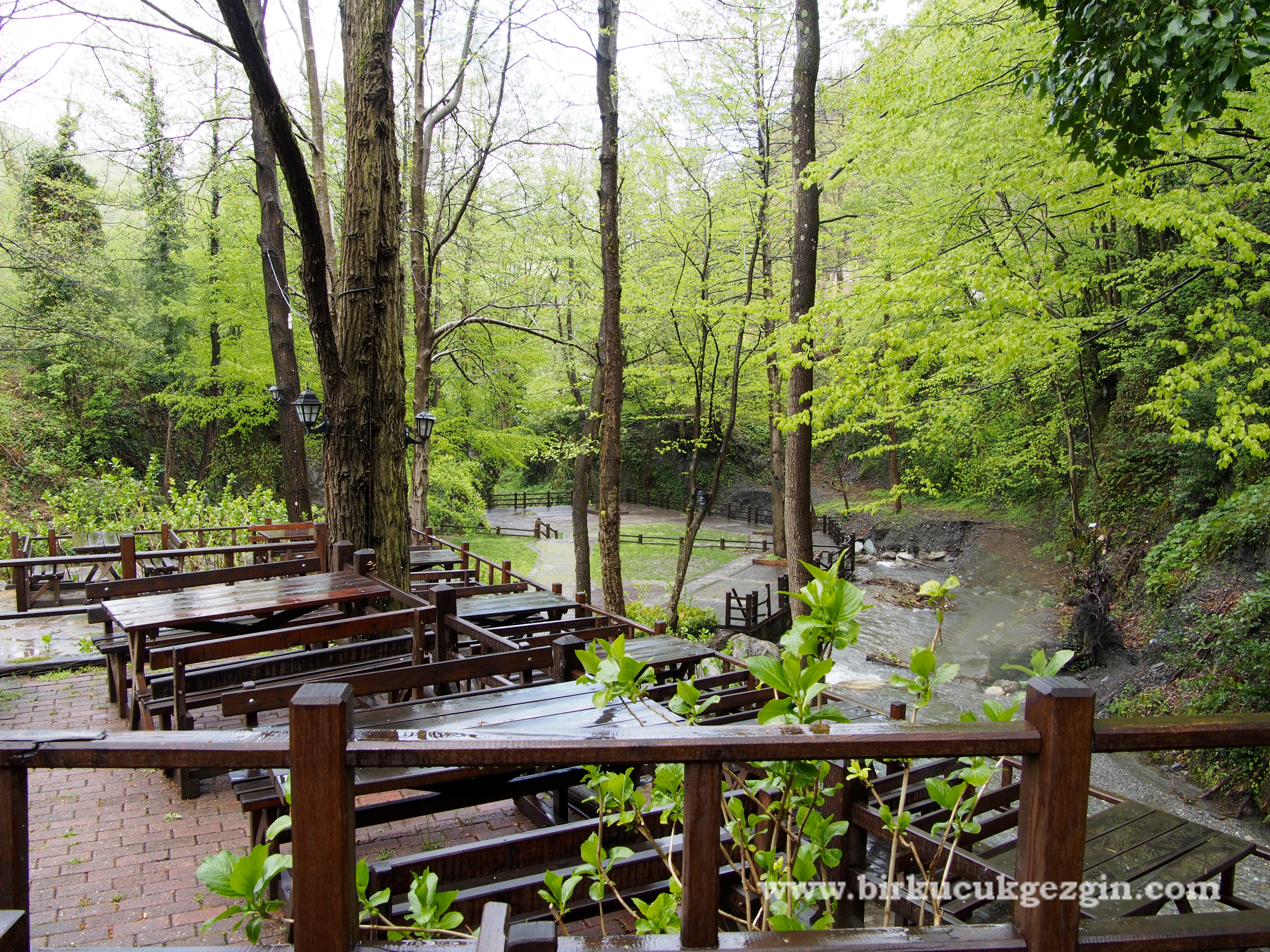 Restoran yemyeşil bir vadinin üst kısmında, vadinin ortasından küçük bir dere akıyor, hatta küçük bir de şelale var. Biz yağmur yağdığı için kapalı alanda oturduk ama burası tam tepe noktada olduğu için ve muhteşem bir manzarası vardı. Açık havada ise su kenarında vadiye doğru uzanan kademe kademe masalar var ki bunlar da çok keyifli gözüküyordu.