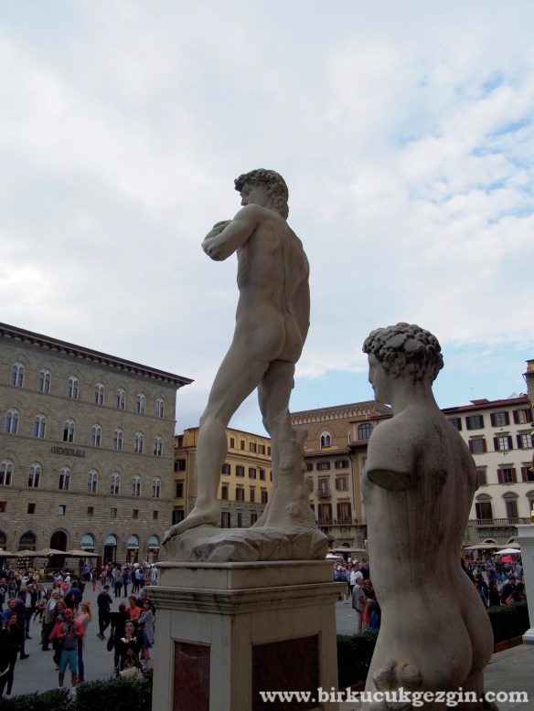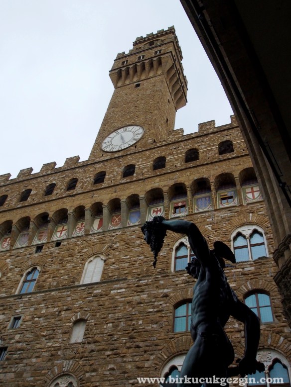 Bir süre daha sokaklarda turladıktan sonra grubun geri kalanı ile Signoria Meydanı‘nda buluştuk. Yüzyıllardır şehrin kalbinin attığı yer olan bu meydan konakladığımız yerlere aşırı yakın oludğu için Floransa’da kaldığımız süre boyunca bizim de buluşma noktamız oldu. Bugün de belediye sarayı olan kullanılmakta olan Palazzo Vecchio, yani Eski Saray’ın bulunduğu Signoria Meydanı, Floransa tarihinde her önemli olay olduğunda eklenen birbirinden etkileyici heykellerle tam bir açık hava müzesini andırıyor. Michelangelo’nun ünlü David heykelinin de gerçek lokasyonu burası ama şu anda replikası burada bulunuyor. Gerçeği yine Floransa’daki Galleria Dell’Academia müzesinde yer alıyor. (Eğer sanata çok özel bir merakınız yoksa Accademia’da David’den başka ilginizi çeken birşey bulamayabilirsiniz.)