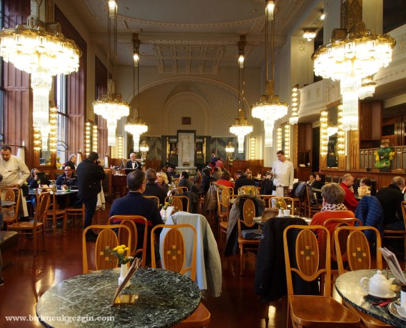 Kavárna Obecní dům: Burası da Prag’ın tarihi mekanlarından bir tanesi. İlk yazımda bahsettiğim Tarihi Belediye Binası’nın altında, yüksek tavanlı, şıkır şıkır saray dekorasyonuna sahip bir yer. Müze gibi fotoğraf çekmek ve en fazla birşeyler içmek için önerebilirim. Zira hayatımda yediğim en kötü apple strudel’i burada yemiş olabilirim. Ama yine de burası da bir deneyim. Oturup birşeyler içmesi keyifli. Her zaman var mı bilmiyorum ama bir de biz gittiğimizde çok yaşlı bir grup müzisyen klasik müzik çalıyordu. Ortam daha da büyülü ve keyifli bir hale gelmişti.