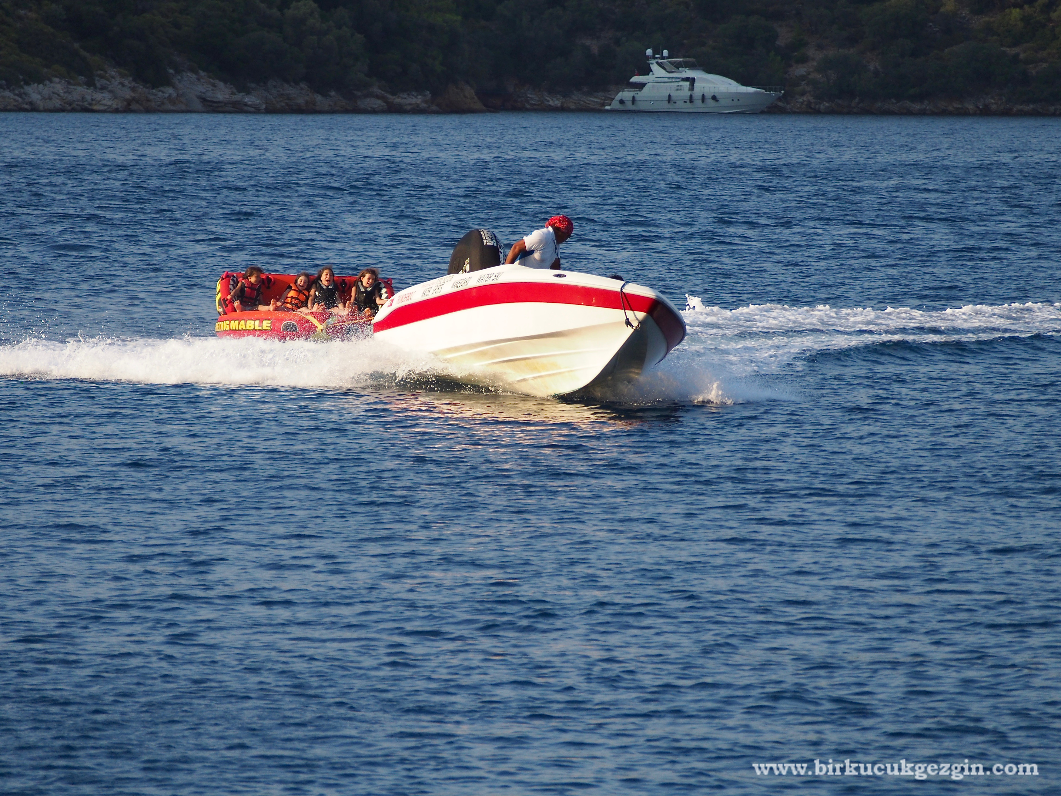 Göcek’e gelince çocuklar için de hamburger, banana gibi deniz eğlenceleri fırsatı doğmuş oldu. 6.5 yaşında olan Bir Küçük Gezgin ilk kez bu aletlere binip deliler gibi eğlendi.