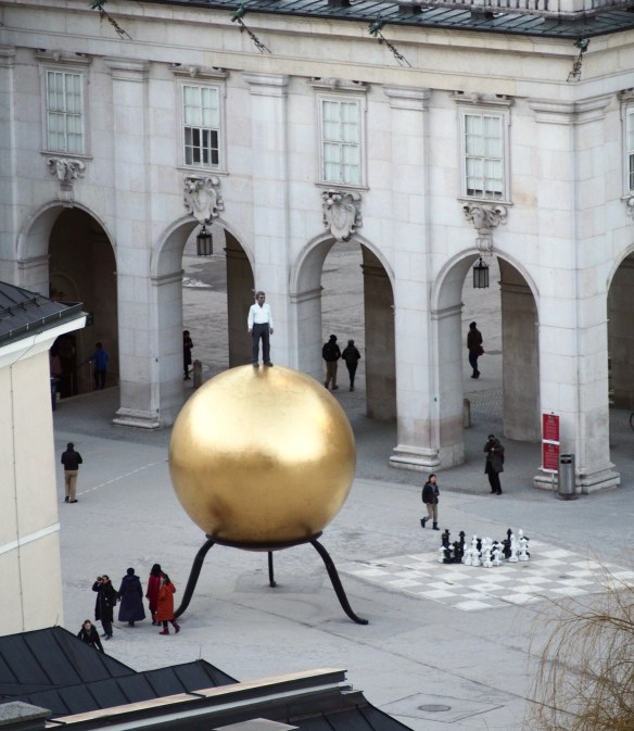 Bir de gezerken illa ki yolunuzu düşüreceğiniz başlıca birkaç meydan var: Mozart anıtının olduğu Mozartplatz, Salzburg Katedralinin bulunduğu Residenzplatz ve üzerinde bir adamın durduğu çarpıcı altın top heykelinin bulunduğu Kapitelplatz. Bu altın toplu heykel 2002 yılında başlatılan bir proje kapsamında meydana yerleştirilmiş. Proje ile 10 yıl boyunca her yıl önemli bir sanatçı davet edilerek Salzburg için ikonik bir eser üretmesi istenmiş ve şehrin çeşitli yerlerine bu heykeller yerleştirilmiş. Tahmin edersiniz ki bu oldukça büyük tartışma konusu olmuş. Sonuçta en fazla dikkat çeken de, en prestijli yeri kapan da bu altın top heykeli olmuş.