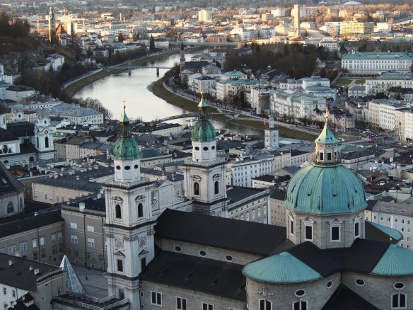 Salzburg Mozart’ın doğduğu yer olduğu için Mozart ile özdeşleşmiş bir kent. Tabii ki en çok gezilesi ve görülesi yeri de eski kent merkezi ve burası sizi adeta Mozart’ın yaşadığı zamanlara götüren, romantik, aristokrat ve çok şık bir açık hava müzesi gibi.Tüm eski merkezini rahatlıkla bir günde yürüyerek dolaşmak mümkün. (Yazının ilk fotoğrafında aslında tüm tarihi merkezi görebiliyorsunuz). Birçok Avrupa kenti gibi ortasından nehir geçiyor ve eski kent merkezi nehrin iki tarafına da yayıldığı için nehir kenarı hem çok keyifli hem de çok güzel manzaralar sunuyor. Siz şu fotoğrafı bir de yaz veya baharda yemyeşilken hayal edin…